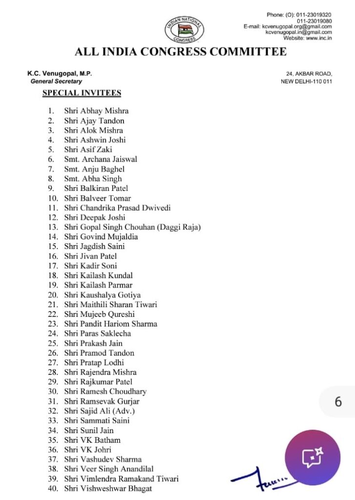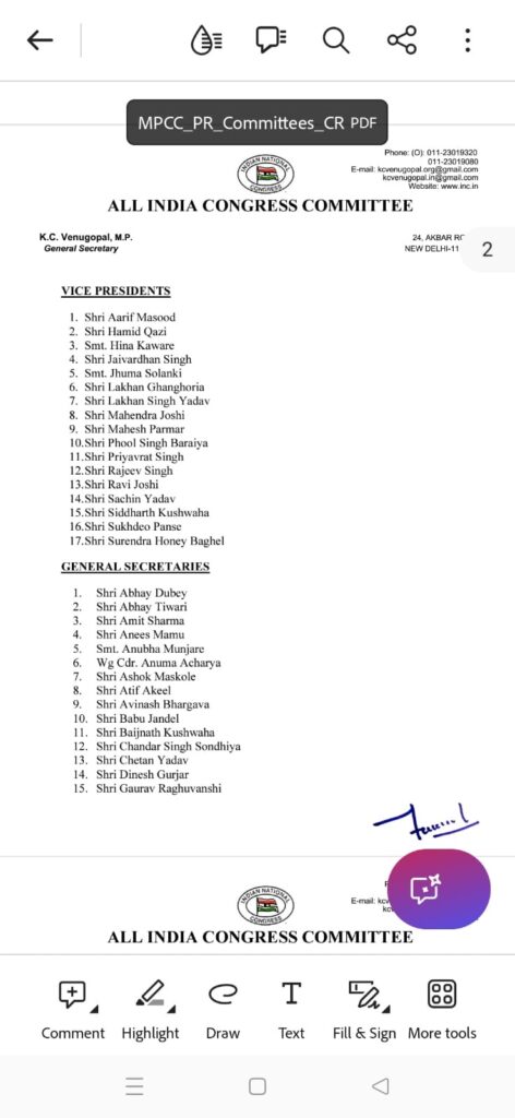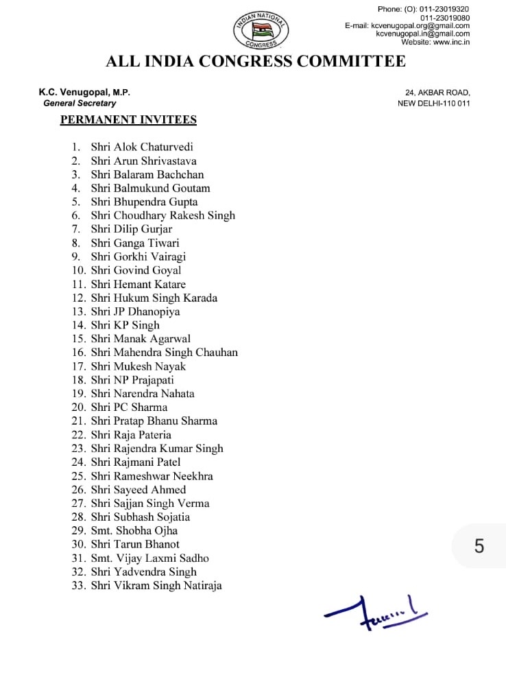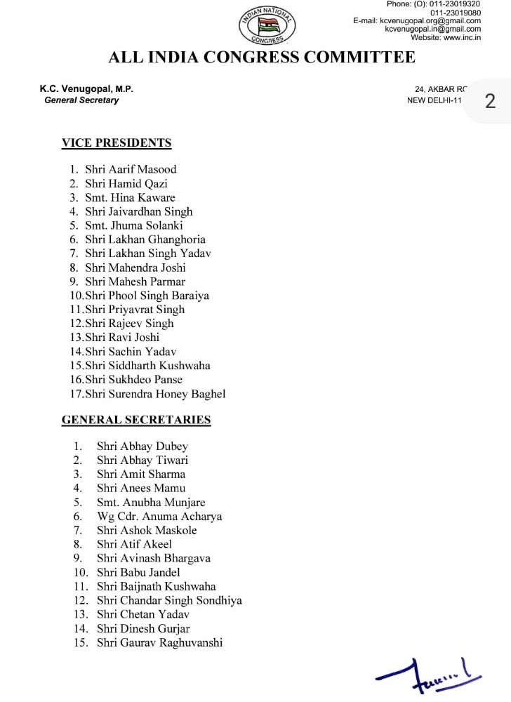 मध्य प्रदेश कांग्रेस की 177 सदस्यीय कार्यकारिणी घोषित की गई है। जिसमें 17 उपाध्यक्ष, 71 महासचिव, 16 कार्यकारिणी सदस्य, 33 स्थाई आमंत्रित सदस्य और 40 विशेष आमंत्रित सदस्य बनाए गए हैं। वरिष्ठ नेताओं को टीम में कार्यकारी सदस्य बनाया गया है।