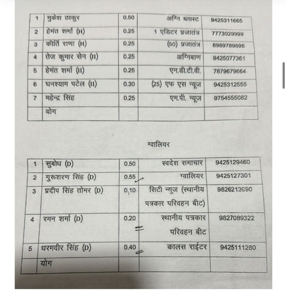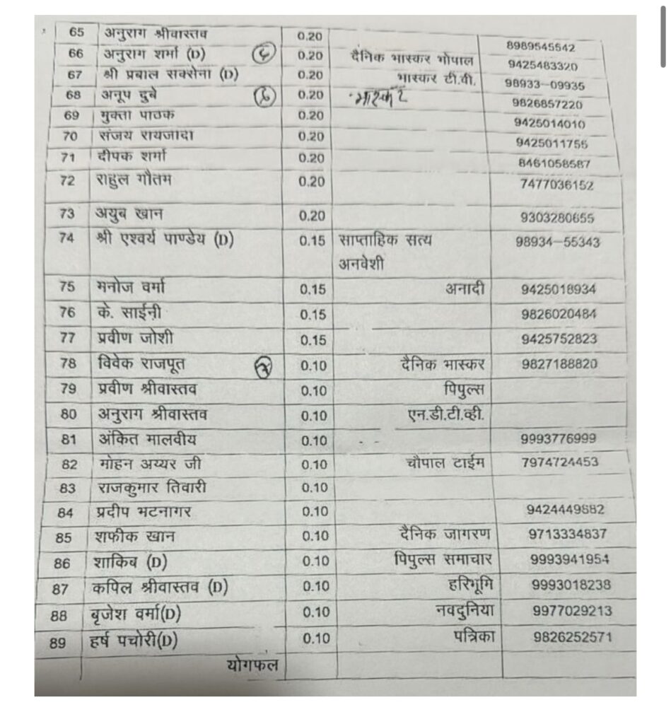 मध्य प्रदेश के पत्रकारों की एक लंबी चौड़ी लिस्ट वायरल हो रही है। इसमें नाम के आगे संख्या और फिर संस्थान का नाम व मोबाइल नंबर दर्ज है। कुछ लोग इसे रिश्वत लिस्ट बता रहे तो कुछ कह रहे ये पत्रकारिता में अदभुत काम करने पर मिलने वाले मेडल की लिस्ट है।