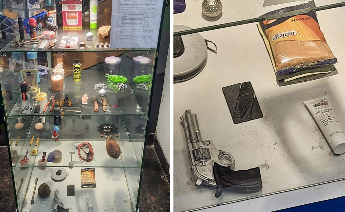 A showcase kept at the airport to inform people about prohibited items contains a packet of jeerawan along with a pistol, knife, scissor, hammer and screwdriver.