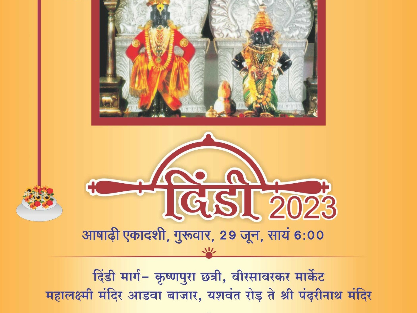 आपको बता दे कि समग्र मराठी समाज द्वारा ये विट्ठल दिंडी यात्रा 29 जून की शाम 6 बजे निकाली जाएगी। यात्रा की शुरुआत कृष्णपुरा छत्री से होगी, जो वीर सावरकर मार्केट, महालक्ष्मी मंदिर, यशवंत रोड होते हुए पंढरीनाथ मंदिर पर समाप्त होगी। इस यात्रा में शहर के अलग-अलग स्थानों से निकलने वाली यात्रा भी शामिल होती हैं और समग्र रूप से पंढरीनाथ मंदिर जाती हैं। कृष्णपुरा छत्री से निकलने वाली यात्रा में शामिल होने के लिए अण्णा महाराज ने जनता से अपील की है।