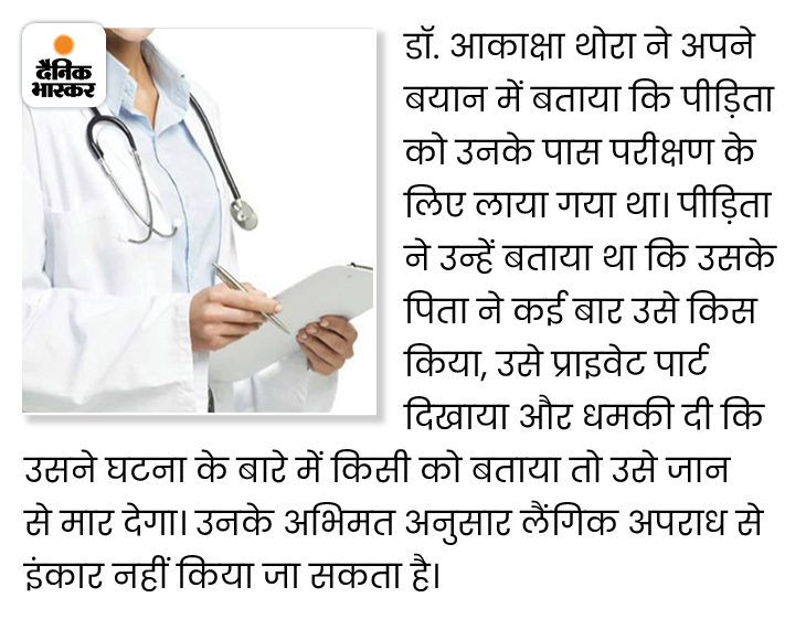 पीड़िता ने कोर्ट को अपने बयान में बताया कि ‘आरोपी उसके पिता हैं। मैं अपने मम्मी-पापा व छोटी बहन के साथ रहती हूं। मेरी मम्मी फैक्ट्री में काम करती है व पापा रेलवे में। जब मेरी मम्मी काम पर जाती थी तब पापा मेरे साथ अश्लील हरकत करते थे। पापा अपना प्राइवेट पार्ट दिखाते और मारपीट करते थे। पापा बोलते थे कि ये बात मैंने किसी को बताई तो मेरी और मम्मी को मार देगा।
