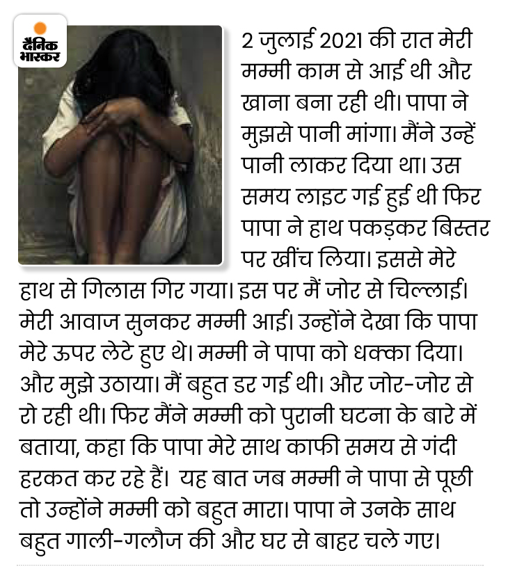 2 जुलाई 2021 की रात मेरी मम्मी काम से आई थी और खाना बना रही थी। पापा ने मुझसे पानी मांगा। मैंने उन्हें पानी लाकर दिया था। उस समय लाइट गई हुई थी फिर पापा ने हाथ पकड़कर बिस्तर पर खींच लिया। इससे मेरे हाथ से गिलास गिर गया। इस पर मैं जोर से चिल्लाई। मेरी आवाज सुनकर मम्मी आई। उन्होंने देखा कि पापा मेरे ऊपर लेटे हुए थे।