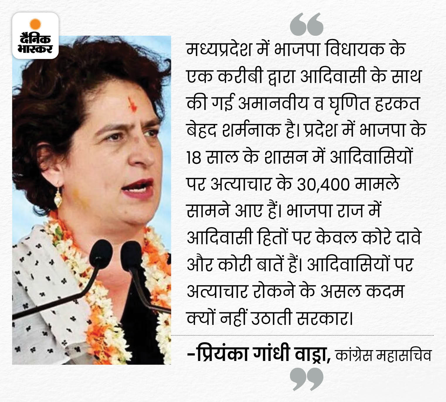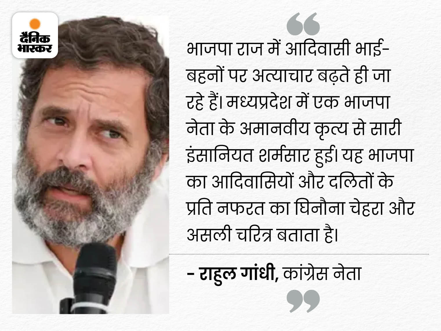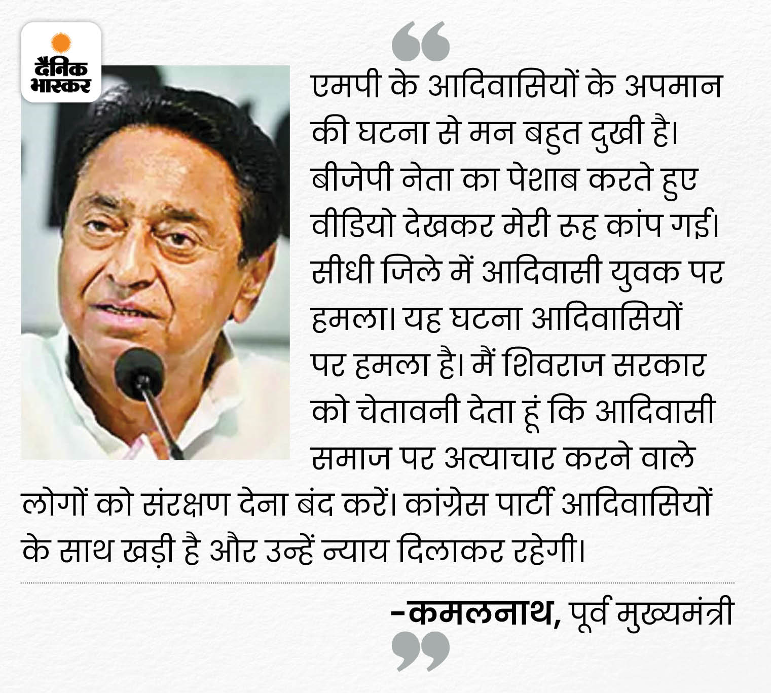 पूर्व सीएम कमलनाथ ने कहा- क्या सत्ता का नशा इस कदर भारतीय जनता पार्टी के नेताओं पर चढ़ गया है कि वे इंसान को इंसान नहीं समझ रहे। यह घटना आदिवासी अस्मिता पर प्रहार है। यह घटना टंट्या मामा और बिरसा मुंडा जैसे महापुरुषों का अपमान है। यह घटना प्रदेश के करोड़ों आदिवासी भाई-बहनों का अपमान है।
