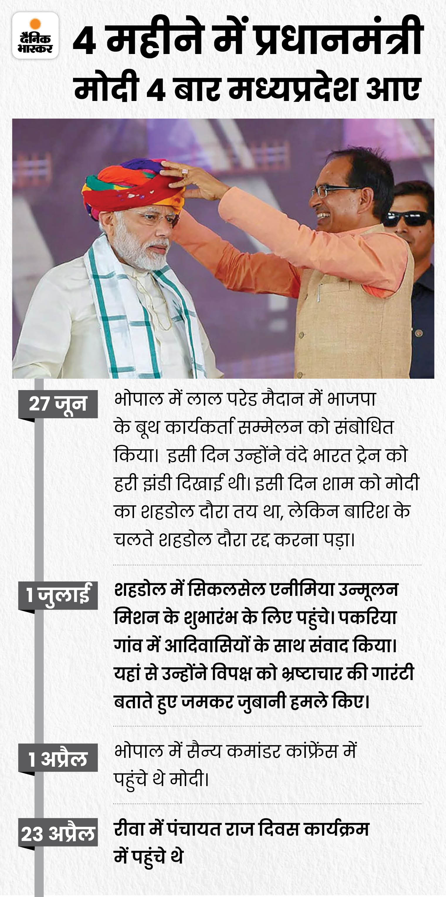 भाजपा के रणनीतिकारों की तैयारी थी एमपी इलेक्शन के लिए ब्रांड मोदी की लॉन्चिंग शहडोल में की जाए, लेकिन आखिरी मौके पर इसे रोका गया। भाजपा चाहती थी कि इससे पहले मोदी के लिए एमपी भाजपा में उनके मनमाफिक टीम बन जाए, जो उन्हें उनके तौर तरीकों के हिसाब से रिपोर्ट कर सके।