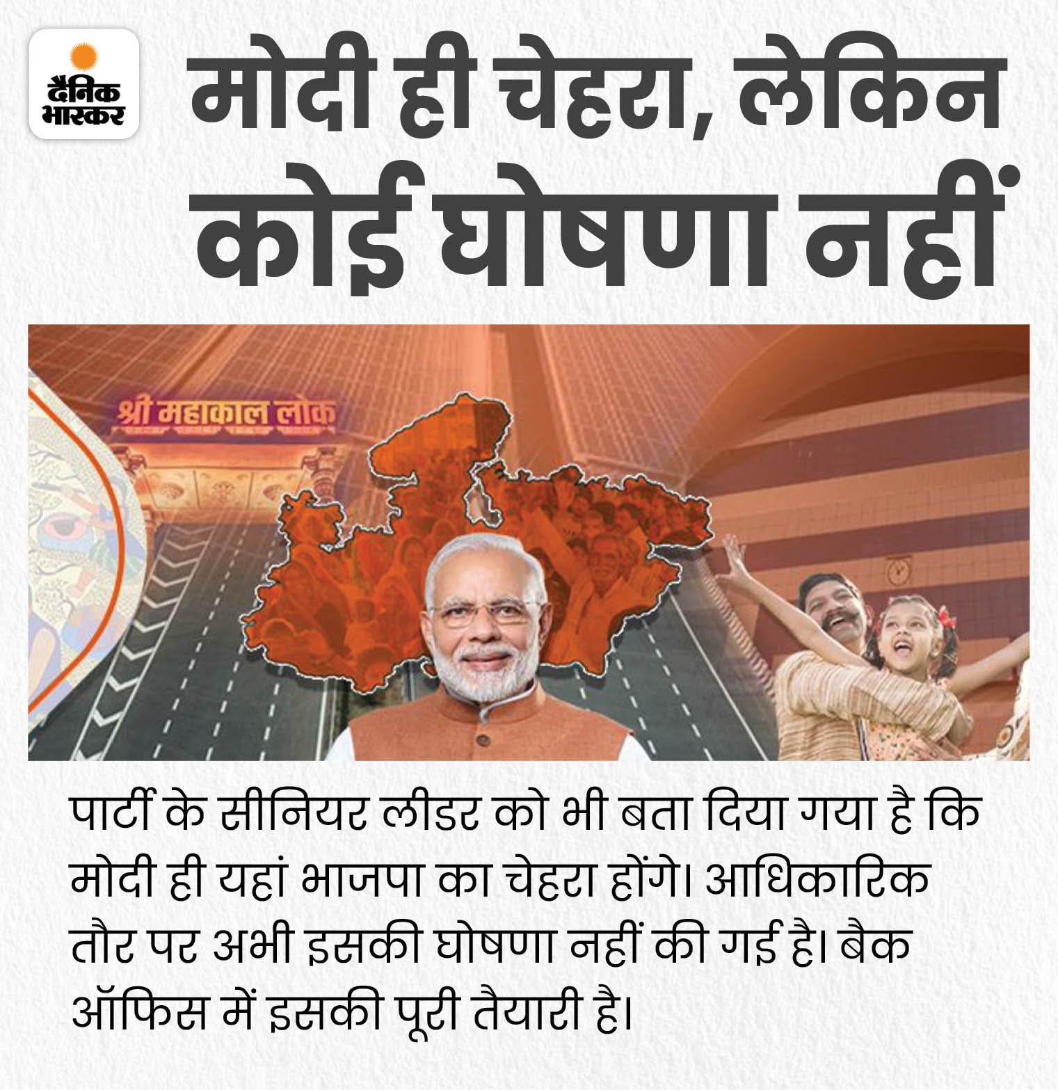 मध्यप्रदेश भाजपा में चुनावी चेहरे को लेकर बना सस्पेंस खत्म हो गया है। प्रधानमंत्री नरेंद्र मोदी के चेहरे पर ही बीजेपी एमपी के चुनावी मैदान में उतरेगी। पार्टी ने इसकी पूरी तैयारी कर ली है। मोदी के मन में बसे एमपी, एमपी के मन में मोदी… थीम पर कई वीडियो गीत बनकर तैयार हैं। इन गानों में उनका पूरा एमपी कनेक्शन बताया गया है। राज्य के साथ केंद्र सरकार की स्कीमों को शामिल कर उनके चेहरे को ही हाइलाइट किया गया है।