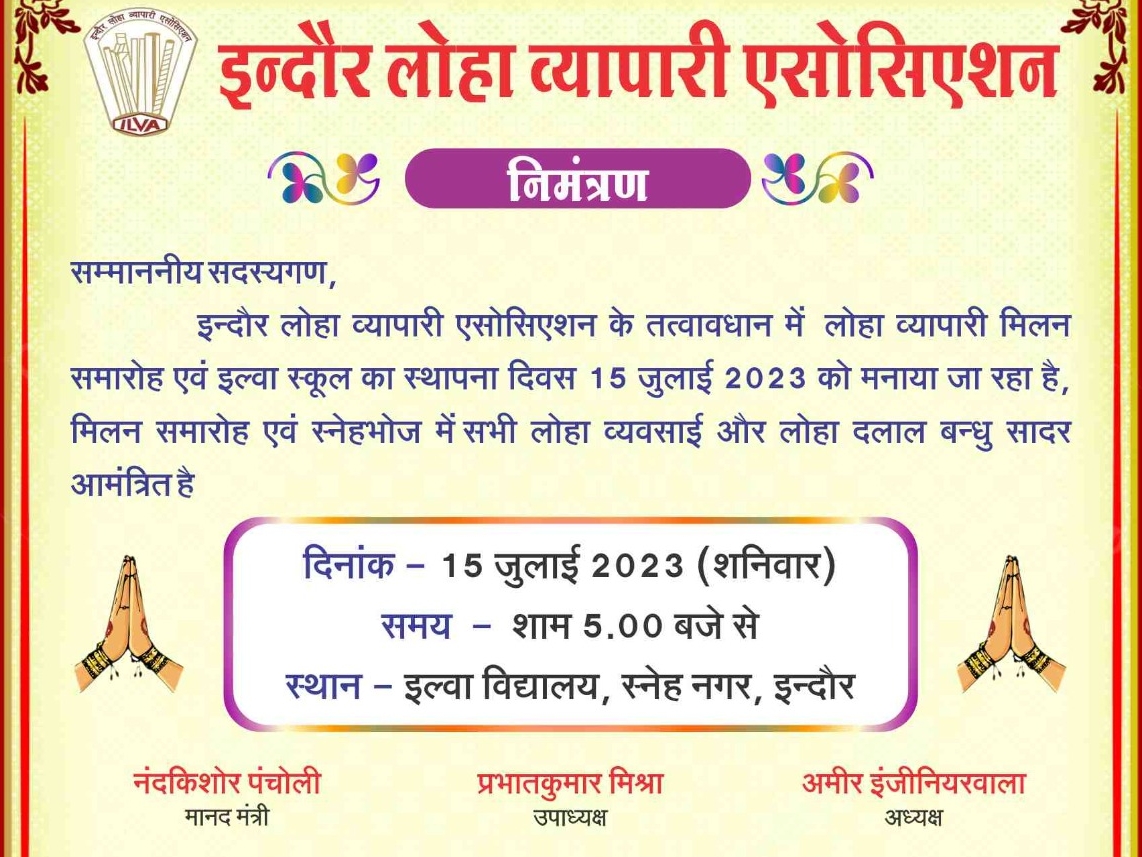इंदौर लोहा व्यापारी एसोसिएशन द्वारा शनिवार 15 जुलाई को लोहा व्यापारियों एवं लोहा दलालों का मिलन समारोह इल्वा स्कूल स्नेह नगर में शाम 5 से आयोजित किया जाएगा। अध्यक्ष अमीर इंजीनियरवाला और मानद मंत्री नंदकिशोर पंचाली ने बताया इस अवसर पर संगीत निशा व सहभोजन की व्यवस्था की गई है।
