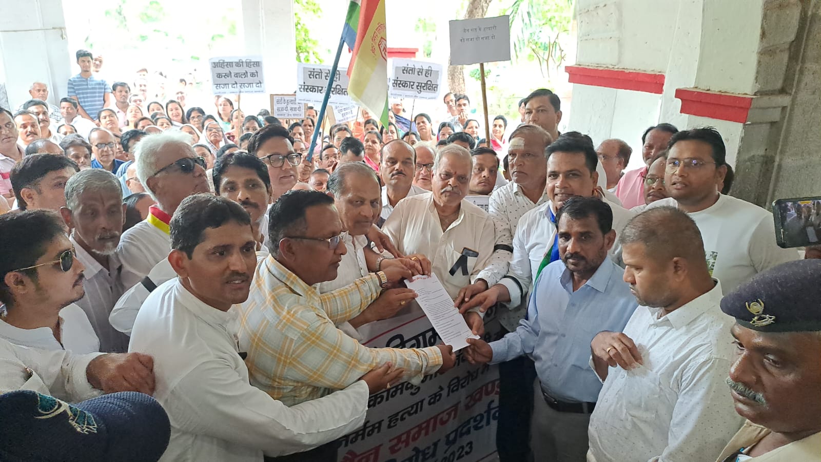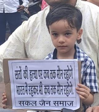 खंडवा में शनिवार को विरोध स्वरूप काली पट्टी बांधकर सकल जैन समाज सहित नगर के धार्मिक, सामाजिक संगठन ने अहिंसा परमो धर्म की जय, महावीर स्वामी का दिव्य संदेश जियो और जीने दो, जैन धर्म की जय, अहिंसा धर्म की जय, साधु संतों का का यह अपमान नहीं सहेगा जैन समाज के उद्घोष के साथ एक वाहन रैली निकाली। कलेक्टर कार्यालय जाकर ज्ञापन सौंपा। सकल जैन समाज के सामाजिक बंधुओ ने उपस्थित होकर धर्म, समाज और साधु संतों की सुरक्षा का संकल्प लेकर ज्ञापन सौंपा।