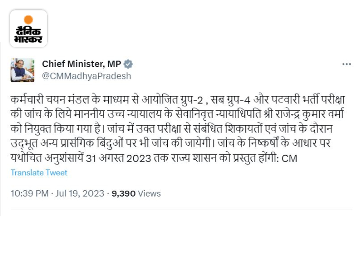 सीएम ने ट्वीट कर लिखा- कर्मचारी चयन मंडल के माध्यम से आयोजित ग्रुप-2 , सब ग्रुप-4 और पटवारी भर्ती परीक्षा की जांच के लिये उच्च न्यायालय के सेवानिवृत्त न्यायाधिपति राजेन्द्र कुमार वर्मा को नियुक्त किया गया है। जांच में इस परीक्षा से संबंधित शिकायतों और जांच के दौरान सभी बिंदुओं पर भी जांच की जाए। जांच के निष्कर्षों के आधार पर यथोचित अनुशंसाएं 31 अगस्त 2023 तक राज्य शासन को प्रस्तुत की जाएंगी।