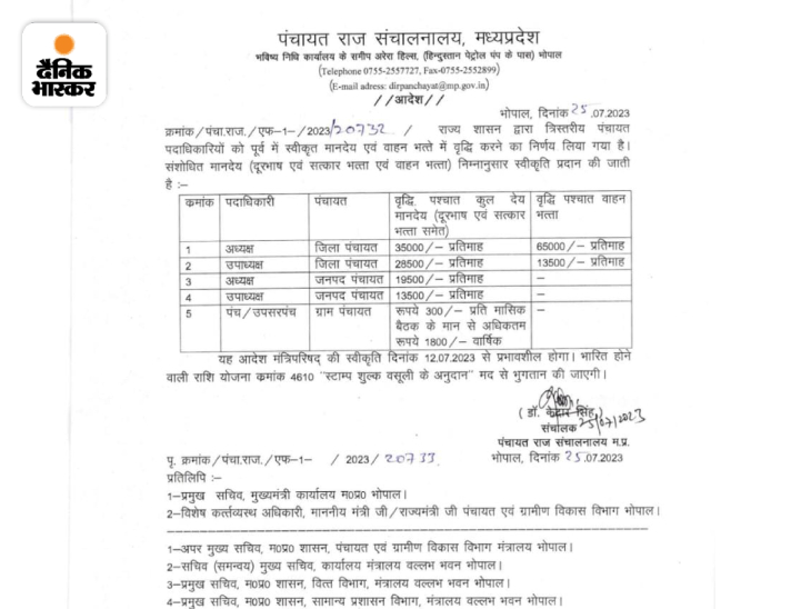 पंचायत राज संचालनालय द्वारा जारी आदेश के अनुसार अब अध्यक्ष को 35 हजार रुपये मानदेय, सत्कार और दूरभाष भत्ता मिलेगा। 65 हजार रुपये प्रतिमाह वाहन भत्ता दिया जाएगा। इसी तरह उपाध्यक्ष को 28 हजार 500 रुपये प्रतिमाह मानदेय, सत्कार और दूरभाष भत्ता मिलेगा। 13 हजार 500 रुपये वाहन भत्ता मिलेगा।