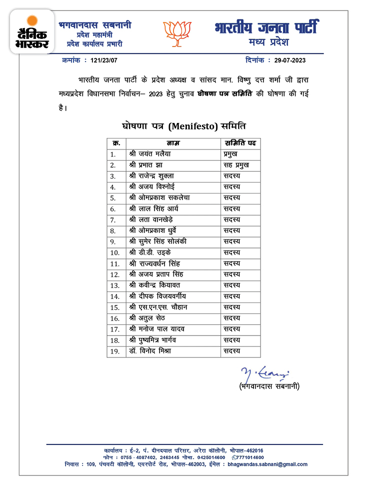 पूर्व मंत्री जयंत मलैया को घोषणा समिति का प्रमुख और प्रभात झा को सह प्रमुख बनाया गया है। इस समिति में 19 सदस्य है। इसके अलावा सभी जिलों के लिए संयोजकों की घोषणा भी की गई है।