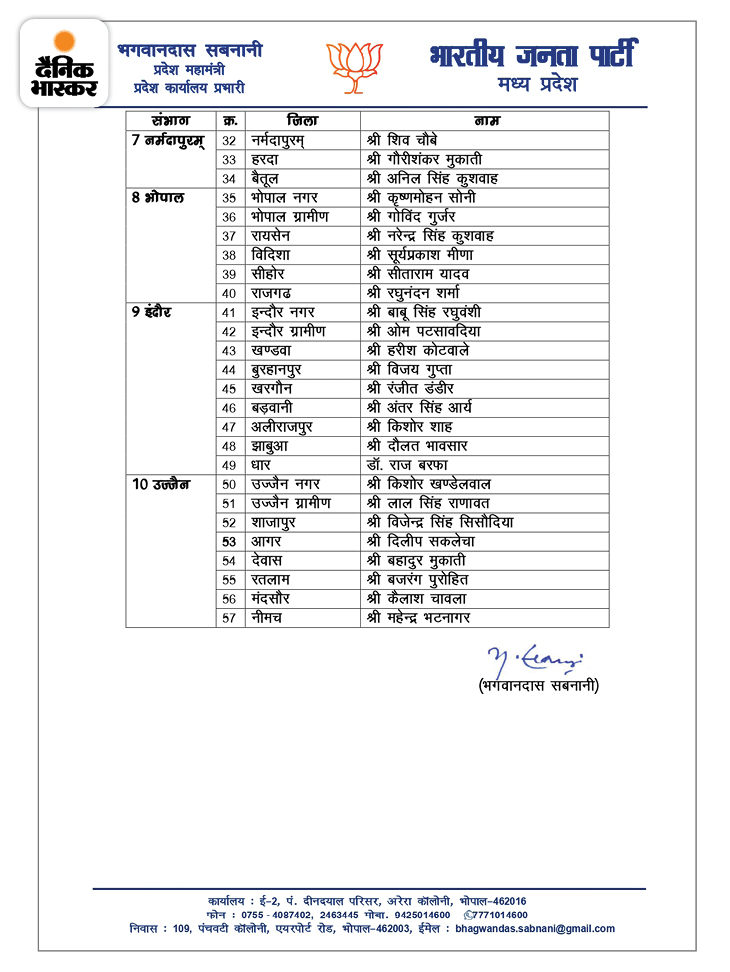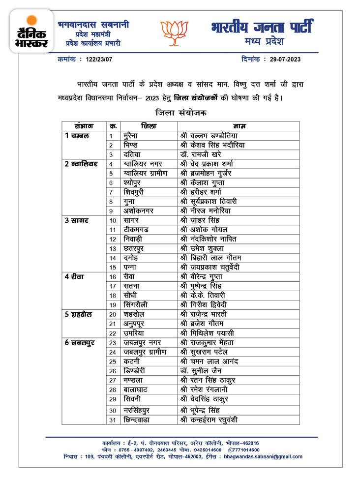 बीजेपी के जिला संयोजकों की सूची