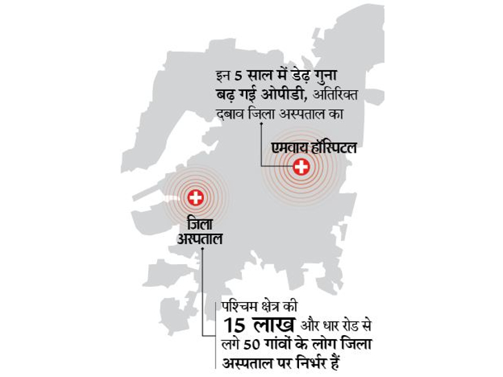 अस्पताल में 30 से अधिक डॉक्टर हैं, लेकिन पांच सालों से एक भी ऑपरेशन नहीं हुआ। पश्चिम क्षेत्र की 15 लाख की आबादी व धार राेड केे 50 गांवाें के लोग जिला अस्पताल पर निर्भर हैं। उन्हें इससे करीब 10 किमी दूर एमवाय जाना पड़ रहा है, जहां की ओपीडी जिला अस्पताल बंद होने से डेढ़ गुना हो गई है।