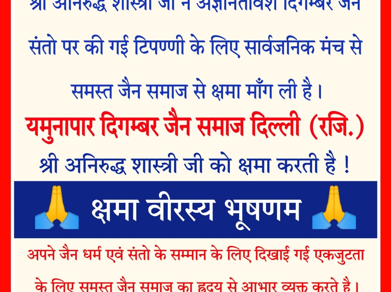 कथावाचक अनिरुद्धाचार्य ने सभी जैन संत एवं समाज से अपने वक्तव्य को लेकर क्षमा याचना की। उन्होंने कहा कि क्षमा वीरस्य भूषणम् जैनों का इतिहास रहा है। क्षमा करने में सिर्फ जैन समाज का ही एक ऐसा त्यौहार आता है, जिसमें सबसे क्षमा याचना मांगी जाती है। कहा जा रहा था कि अनिरुद्धाचार्य ने अपने प्रवचन के दौरान कुछ ऐसे शब्द का प्रयोग किया था, जिससे जैन समाज में असंतोष व्याप्त हो गया था। गुरुवार को दिल्ली में एक वीडियो में उन्होंने संत समाज से क्षमा प्रदान करने की प्रार्थना की। उन्होंने कहा कि यदि मेरी किसी बात से किसी को दु:ख पहुंचा हो तो मैं उसके लिए क्षमा मांगता हूं।
