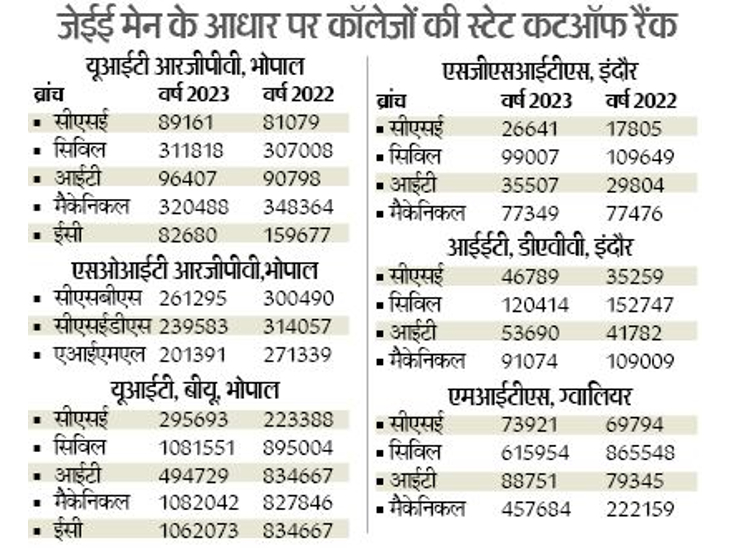 इंदौर एसजीएसआईटी, आईईटी-डीएवीवी और ग्वालियर के एमआईटीएस की कटऑफ रैंक यूआईटी आरजीपीवी की अपेक्षा हाई है। कंप्यूटर साइंस इंजीनियरिंग (सीएसई) के लिए यूआईटी-आरजीपीवी में स्टेट कटऑफ रैंक 89161 रही। पिछले साल की तुलना में यह 8082 रैंक नीचे आई है। साथ ही यूआईटी-आरजीपीवी की सीएसई की कटऑफ रैंक इंदौर के आईईटी-डीएवीवी की कटऑफ से 42,372 रैंक नीचे आई है।