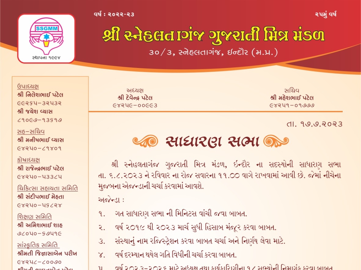 श्री स्नेहलतागंज गुजराती मित्र मंडल इंदौर की साधारण सभा रविवार को आयोजित की गई है। ये सभा गुजराती समाज गेस्ट हाउस स्नेहलतागंज में सुबह 11 बजे से शुरू होगी। सभा में संस्था के कार्यक्रमों की जानकारी दी जाएगी।