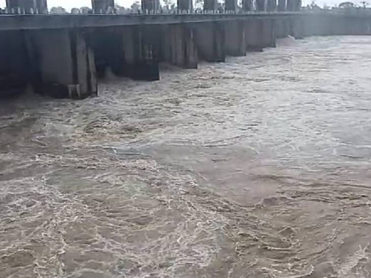 बकिया बराज का गेट खुलने के बाद टमस नदी में तेजी से जाता पानी।